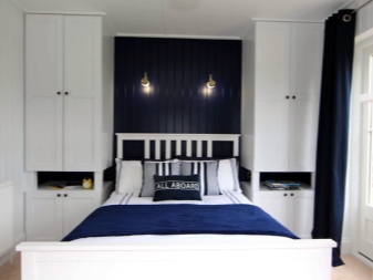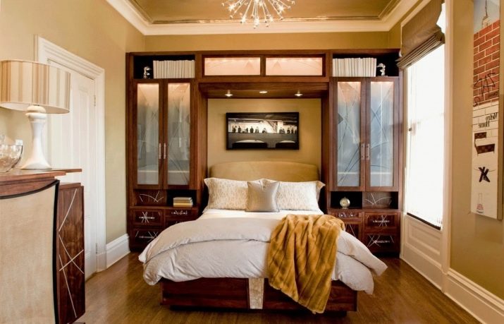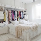 Често се случва малка спалня да не побира гардероби с врати на шарнири; вместо това трябва да опитате врати, които могат да се раздвижват, или завеса от акордеон. Възможността за инсталиране на вградени мебели – това могат да бъдат гардероби, рафтове – спестява място за малка спалня. Интересна идея за съхранение на дрехи: можете да закачите дрехи с неща от тавана или на отворени стелажи. Понякога голямо легло има голямо пространство, което може да се използва като място за съхранение. Тя може да бъде прибираща се или повдигаща система.
