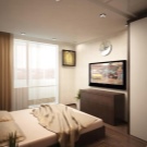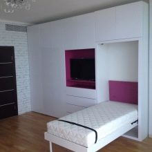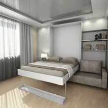 Изпълнението на идеята за минимализъм ще позволи на жителите да спестят място и да получат набор от мебели, необходими за отдих. Мебелите, които ще имат същия цвят като стенните покрития, ще станат невидими и следователно ще помогнат за увеличаване на стаята..