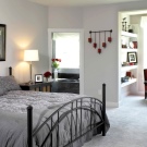 Плътното подреждане на мебелите ще помогне да се освободи място в една част от спалнята, което също така ще увеличи визуално стаята.. Можете да инсталирате легло, нощни шкафчета и окачени рафтове в едната част на стаята, а просто да поставите килим в другата..