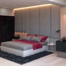 Сивата спалня ще добави строгост и лаконичност, и може да се разрежда с ярки възглавници или картини в цветни рамки.