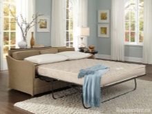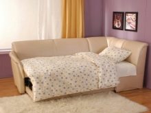 Обемният шкаф ще замени отворените рафтове или стелажи, които са удобно разположени на специална ниша. Можете да използвате тесен шкаф, който ще побере необходимите неща. Спалното бельо може да се прибира на дивана.