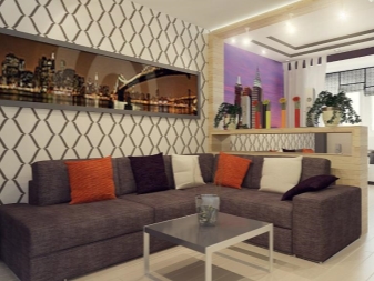 Стенната декорация може да се направи за боядисване или тапетиране. Тъй като тази стая, освен хола, ще служи и като място за почивка, стените трябва да са светли, без големи и ярки рисунки. Това правило трябва да се спазва особено, ако прозорците са обърнати към северната страна. При липса на естествена светлина цветът на стените ще изглежда два нюанса по -тъмен. Вертикалната лента визуално прави стаята по -висока, а хоризонталният модел разширява пространството.