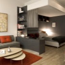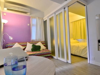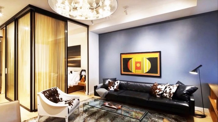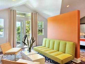Преградата може да бъде гипсокартон или стъклена стена. Това ще подобри интериора и ще реши проблема с личното пространство. Интересен начин може да бъде място за спане, оградено със стена от гипсокартон с необичайна форма. И диванът може да бъде инсталиран с гръб към преградата, така че да изглежда, че това е краят на стаята..