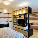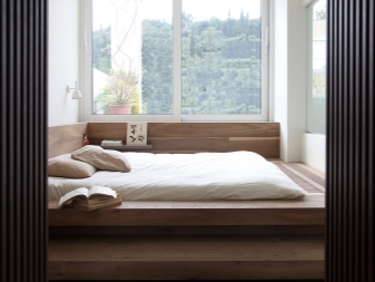 Инсталирането на подиум ще помогне визуално да раздели пространството. Върху него е монтирано легло, а в нишата му могат да бъдат направени изтеглящи се контейнери за съхранение на вещи. Можете да прикрепите LED лента по периметъра на подиума, което ще добави мистерия към интериора на тъмно.