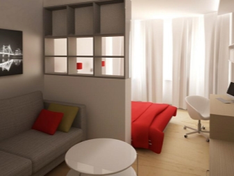 Друг интересен вариант е рафт. За да разделите стаята на 16 метра и да добавите уникалност към нея, могат да се използват леки рафтове с проходни рафтове. По този начин артикулите на рафтовете ще блокират една област от друга..