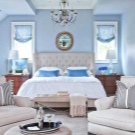 Те често се използват в дизайна на спални. Известно е, че именно сините тонове помагат да се отпуснете, да се успокоите и това е важно преди лягане. Трябва да се отбележи, че атмосферата ще бъде не само спокойна, но и стилна. В допълнение, тези нюанси правят интериора по -“свеж”. Комбинацията със златни и кремави аксесоари ще изглежда добре..