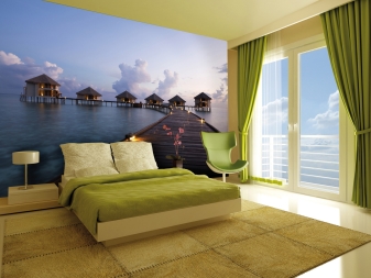 - С фототапет. Тази опция ще бъде чудесна за тези, които ценят стилен и модерен декор на спалнята. Можете да изберете модела, който ви харесва. Това могат да бъдат различни пейзажи, изображения на водни капчици, герои от любимите ви филми. Струва си да се отбележи, че добре подбраните фототапети ще помогнат не само за декориране на стаята, но и за промяна на нейните пропорции..