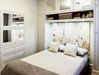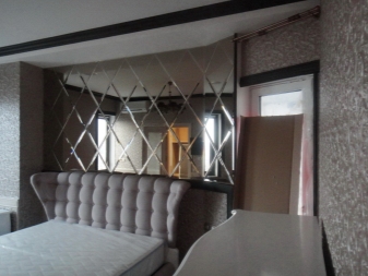 - Огледални панели. Това е още един забавен и модерен начин да придадете на спалнята си оригинален вид. В същото време можете също да коригирате геометрията на пространството. Ако имате класическа спалня, квадратните скосени плочки са идеални. Ако предпочитате да създадете интериор според принципа на минимализма, тогава можете да използвате огледални триъгълници..