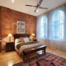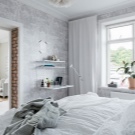 - Снимката показва една от дизайнерските възможности на малка квадратна спалня.. Дизайнерът се отказа от използването на шкафове в полза на малък рафт и закачалка, с помощта на които се постигат значителни икономии на място. Тъй като стаята не е много светла, допълнително се прилагат алтернативни източници на светлина, въпреки факта, че главата на леглото е точно под прозореца. Светлата стена добавя нотка на модерност към интериора. Използването на избелена тухлена зидария е типичен ход за стила на таванското помещение, в който е направена тази стая..