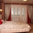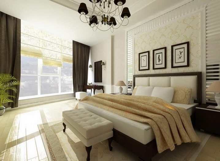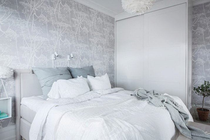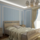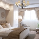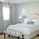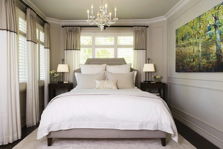 Малка правоъгълна спалня изглежда по -широка и по -голяма благодарение на използването на светли цветове в интериора и контрастни корнизи. Дизайнерите визуално балансират пропорциите на стаята, като поставят леглото напречно и по този начин визуално “Рязане” пространство.