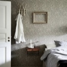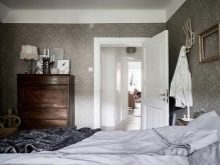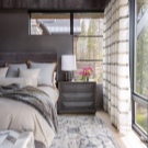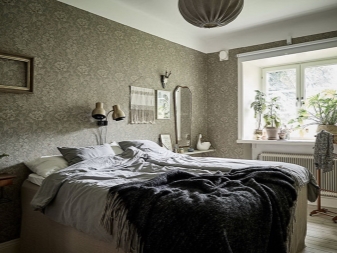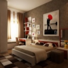 - Тази опция за дизайн е представена в Швейцарски апартамент. Въпреки тъмната цветова гама, стаята не изглежда мрачна, а напротив, тя е много уютна и благоприятна за релаксация. Интересно интериорно решение е използването на необичайни декорации за стени (празна претенциозна рамка, бродирана кърпа и т.н.). Уют се добавя от саксийни растения, свещи и топло одеяло, небрежно хвърлено върху леглото.