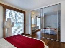 - Стъклена чаша. Такива врати визуално спомагат за разширяването на пространството, което го прави по -светло и по -удобно. Има възможност за създаване на всякакъв модел на стъклената врата. За спалня обаче такива врати не са най -добрият вариант, тъй като се отличават с висока пропускливост на звука..