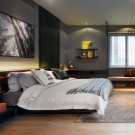 Обикновено правоъгълните спални са много тесни, така че основната задача е визуално да разширите пространството.. Често обаче акцентът върху формата на стаята се оказва единственото правилно интериорно решение.. Например в този случай дизайнерите „разтеглиха“ стаята още повече, използвайки хоризонтални циментови елементи по стените и геометричен модел на подовете..