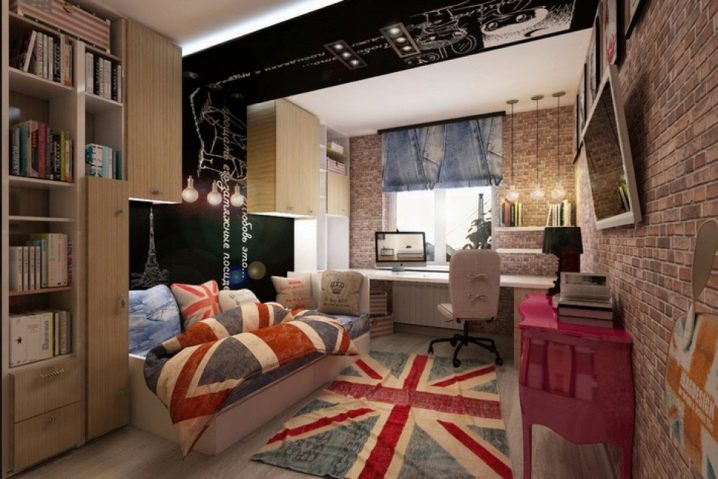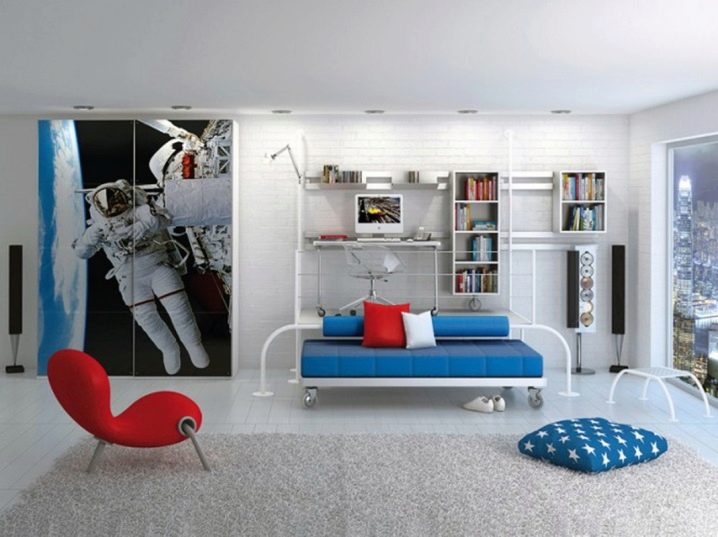 - Друга чудесна идея за подреждане на място за спане на тийнейджър. Стаята е достатъчно светла, но в същото време стилна и дискретна, изпълнена по минималистичен начин. Интересно интериорно решение е повтарящ се отпечатък върху възглавници и тахти, повтарящ картината на таблата..