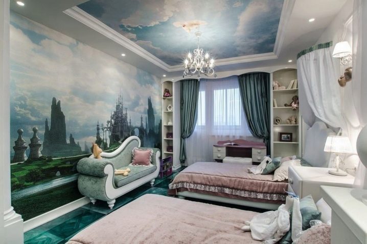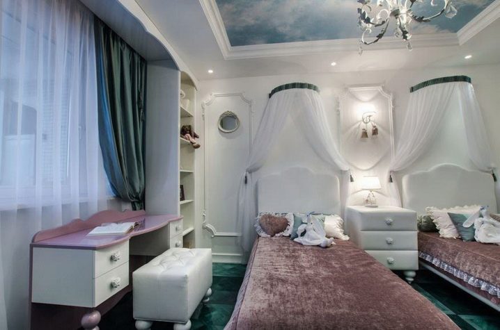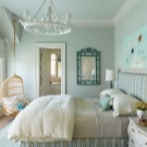 - Чудесен вариант за спалня за момиче. Пастелните нюанси, избрани за основна цветова схема, ще ви помогнат бързо да се настроите на спокойно настроение и да заспите. Висящ люлеещ се стол ще се превърне в любимо място за почивка. Красив полилей във формата на корона е чудесно допълнение, за да накарате едно момиче да се чувства като малка принцеса. Голям плюс е, че основният цвят не е бит розов, а тюркоазен. Почиването в такава стая влияе благоприятно върху качеството на съня..