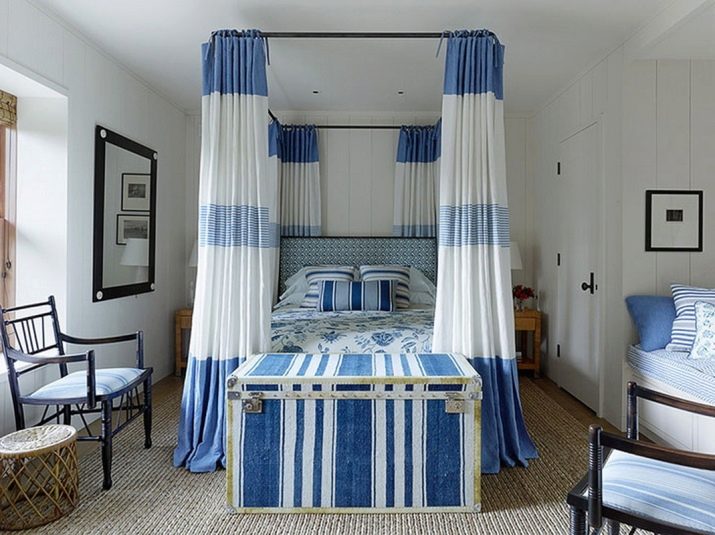 - Тази стая се намира в една от къщите на брега на Калифорния.. Всеки човек, който е в него, воля-неволя, ще усети атмосферата на лекота и свежест, която цари тук. Синьото традиционно се смята за цвят на късмет, спокойствие и спокойствие, така че спалня, обзаведена по този начин, ще помогне да се добави релакс към атмосферата. Интересно е и как се играе селски стил в този случай. Не изглежда твърде просто, напротив, стаята изглежда много елегантна и стилна..