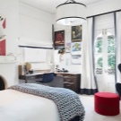- Интериорът на тази лондонска стая е невероятно ярък, но в същото време дискретен.. Напоследък червеният цвят е изключително популярен. Изглежда страхотно в комбинация с обзавеждането в бяло, не изглежда наперено. В този случай оранжевият пуф играе ролята на контрастен акцент, добавяйки фино жизненост към сдържана класическа обстановка..