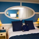 - Сини нюанси в интериора те ще ви помогнат да се чувствате по -спокойни и по -комфортно в такава стая, но не бива да правите спалня изцяло в синьо. Твърде много синьо наоколо води до апатия и депресия..