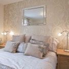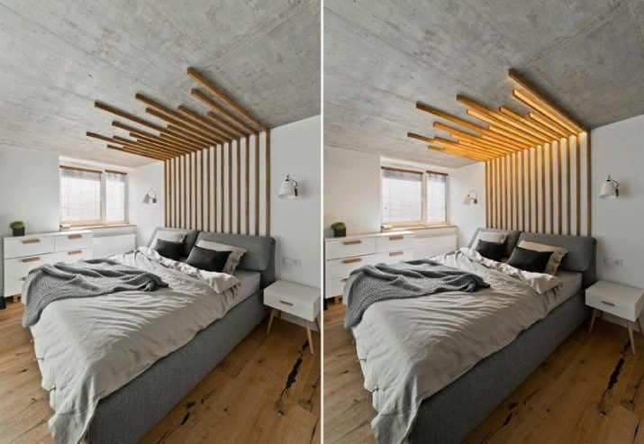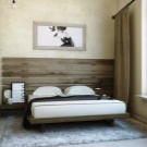 - Изглежда оригинално в спалнята акцентна повърхност над таблата. Може да бъде направен от дървени панели или текстилни тапети в рамка. Може да има всякакви шарки и изображения. Мазилката над леглото изглежда добре, което добавя изисканост и аристократичност към спалнята.