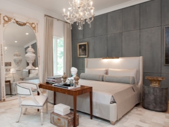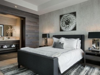 Декоративната боя може да замени хартиения тапет, което ще помогне за постигане на естествен и естествен дизайн. Той има много предимства (екологичност, издръжливост, безопасност), така че може да замени други довършителни материали. В стая с два прозореца не е нужно да се притеснявате за осветлението. Следователно стенните панели могат да бъдат с тъмни цветове. Сивото изглежда особено добре в спалнята, която може да бъде украсена с бяла картина. И ако има само един прозорец, тогава основната идея е насочена към допълнително осветление..