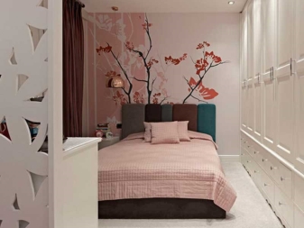 Не трябва да забравяме, че голям брой тъмни цветове и изобилие от стенни аксесоари ще намалят спалнята. По -добре да използвате светли пастелни цветове..