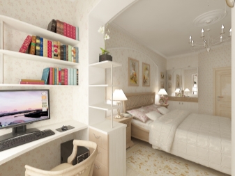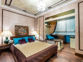 Истинският проект на тясна спалня с лоджия е направен в класически стил. Той комбинира две стаи, което направи възможно създаването на работна зона на балкона.