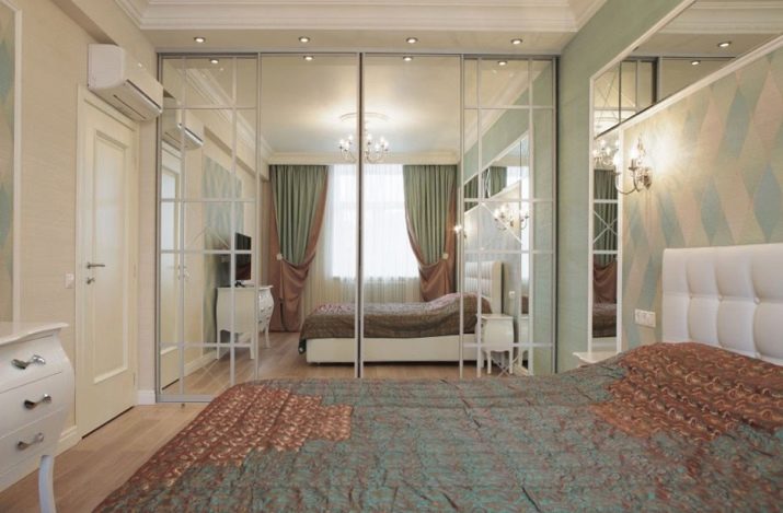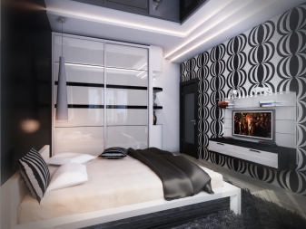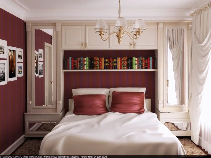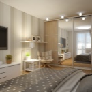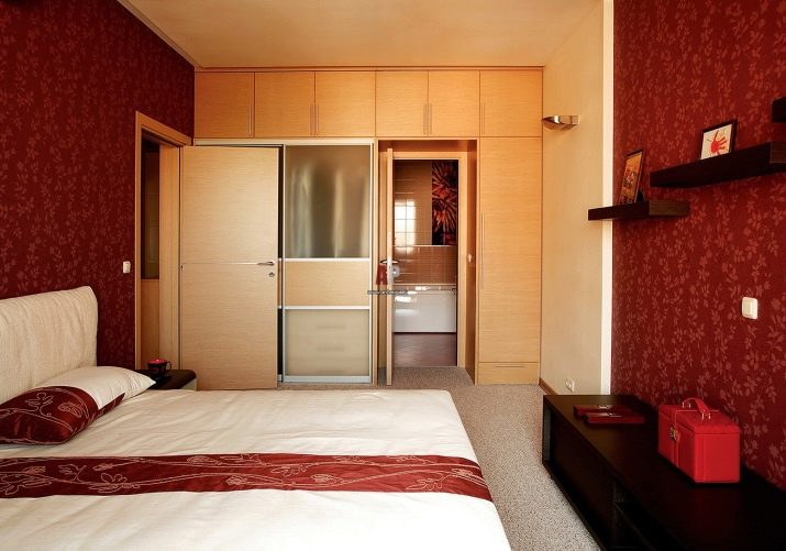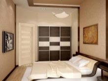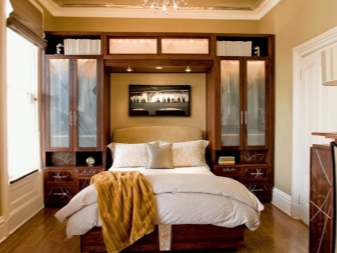 Ако измервателните уреди позволяват, тогава в спалнята може да се постави гардероб. Ще бъде по -добре, ако това е отделение до цялата стена и до тавана. Гардеробът е идеален дори за малка спалня, където се отпускате и обличате, съхранявате личните си вещи. Той ще бъде невидим на пръв поглед и ще създаде квадратна форма за стаята. Дизайнът на отделението абсолютно няма да пречи на ежедневието и няма да “открадне” скъпи измервателни уреди. Тя може да се превърне в цял акцент в стаята и да помогне в нейното зониране..