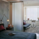 Или зониране. Тясна, дълга стая трябва да бъде разделена на две части – зона за спане и зона за почивка / работна зона / зона за съхранение на дрехи (съблекалня). В тясна спалня е подходящо да подчертаете границата с тънка преграда или малък стелаж или по -добре визуално – с помощта на различни цветове на тапета.