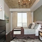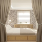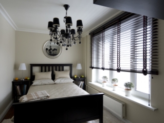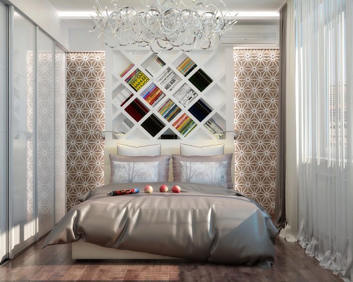 За тясна спалня са подходящи текстилни изделия с геометричен печат – райета, пръстени, квадрати. Не забравяйте да използвате лента: хоризонтална върху покривалото или вертикална върху завесите.