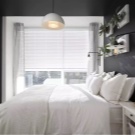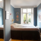 Страхотна идея – поставянето на леглото в задната част на стаята и “играйте” с два цвята (син и бял). Контрастът се създава от бяло и черно (синьо). Той се допълва от снежнобял текстил и се разрежда с кафяви дървени мебели..