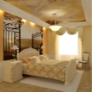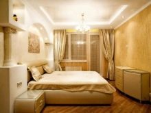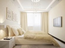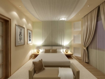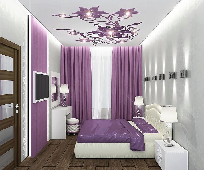 Осветлението благоприятно подчертава пропорциите на помещението (макар и изкуствено създадено). Точковото осветление, разположено по периметъра му, не е подходящо за тясна спалня. Този дизайнерски ход е подходящ за квадратна стая. Най -добрият избор би бил класически полилей (строго в средата), както и няколко подови лампи, направени в стила на стаята.