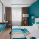 Контрастна (или акцентна) стена ще помогне за визуално разширяване на стените – тя може да бъде една. Тя трябва да бъде допълнена с текстил от същата цветова гама..