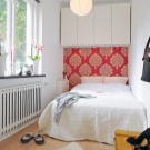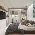 Що се отнася до съхранението, не забравяйте за повдигане на легла или чекмеджета.. Те значително облекчават малък апартамент и ви позволяват да не инсталирате друг килер в спалнята, да не претрупвате балкона. Можете да оборудвате системата за съхранение точно над леглото – чифт стенни шкафове изглеждат хармонично в интериора и облекчават натоварването от пода.