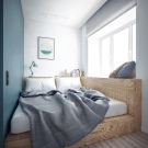 Малката спалня 2 × 4 изглеждаше безнадеждна, но не – вижте сами. Дизайнерът умело комбинира леглото с чифт кутии за съхранение и декор. Нищо допълнително!