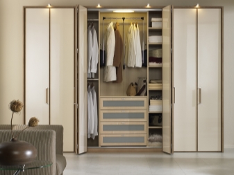По вид гардероб. В този случай продуктът ще съдържа всички необходими отделения, рафтове, чекмеджета или дори скринове. Такъв шкаф може да бъде доста впечатляващ по размер. Вътре ще има достатъчно място, за да се поберат всичките ви дрехи, както и други необходими аксесоари..