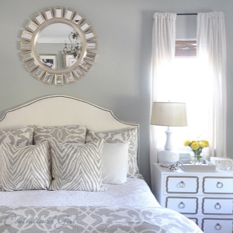 Можете също така да украсите стената с огледало.. Такъв атрибут ще изпълнява само функцията на декорация, защото не е много удобно да изглеждате в такова отражение. Огледалото принадлежи към неутралния компонент на стаята, защото не допълва стаята с бои и цветови нюанси, в сравнение с фототапетите и елементите за рисуване. Ако изберете правилната рамка за огледалото, тя може да подчертае стила на стаята. С помощта на огледала можете визуално да коригирате зоната на спалнята.