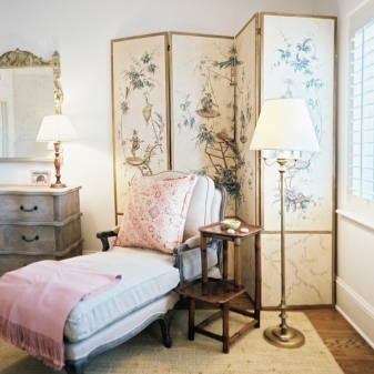 - екран. Създава се чрез сглобяване на дървена рамка, в която има повече от три секции. След като създадете рамката, ще трябва да я покриете с текстил. Ако използвате секции със среден размер, те трябва да са със същия размер като ширината на леглото. Секциите, разположени отстрани, трябва да са малко по -големи от средните. С помощта на екран ще предпазите съня си от ярка слънчева светлина и ще осигурите допълнителен комфорт в стаята;