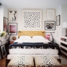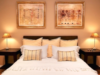 Две картини със среден размер, направени в същия стил, изглеждат добре. Те могат да бъдат окачени както над леглото, така и над ниско нощно шкафче, тоалетка или скрин. Ако има няколко платна, но не повече от четири и те са различни по размер, тогава се препоръчва да ги подравните по долния ръб и да ги окачите на нивото на очите. Тъй като висящи ниско или обратно, твърде високите картини изкривяват геометрията на пространството на спалнята.