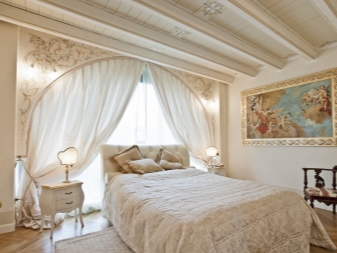 Можете също така да поставите произведения с различни размери на рафта, но не много. Три – четири снимки са достатъчни. Формата на картината също е важна. Ако спалнята има полукръгли прозорци, сводеста ниша, овално огледало, тогава можете спокойно да закачите картина със заоблени форми или с начертан кръг. В противен случай такова изображение няма да изглежда хармонично, като чужд обект..