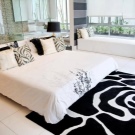 Обратният вариант е забележим килим, контрастен. Основната му задача е да подчертае цвета на мебелите с противоположни нюанси. Така например черен или шоколадов килим визуално ще избели бялото легло още повече и обратно..
