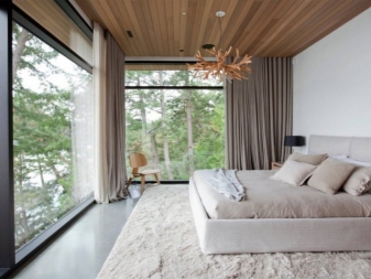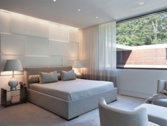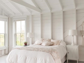 Строг, лаконичен, дискретен, практичен – всичко това Минимализъм. Това е най -подходящият вариант за малки спални. Минимум мебели и само няколко декоративни елемента са основните принципи, които трябва да се спазват при декорирането на стая в този стил. За спалня в селска къща се нуждаете само от легло, малка нощна шкафче и висок гардероб от мебели. Цветовата схема може да бъде различна, но дизайнерите съветват да се използват три цвята. Единият от тях ще бъде основният, вторият ще бъде допълнителен, а третият ще действа като акценти.