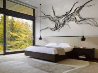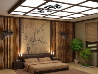 Азиатският стил привлича с изтънченост, мистерия и изтънченост. Японската тема в интериора е много популярна. Посоката се придържа към минимализма – минимум неща, максимум пространство. Като декорация се използват типични за Япония елементи: клони от сакура (те могат да бъдат изобразени на стени, текстилни материали или в друга форма), бамбук, лампи с характерна форма, изображение на йероглифи. Дървото бонсай ще изглежда страхотно в спалнята. Можете да изберете черно -бяла опция за дизайн или контраст на ярки цветове с деликатни тонове.