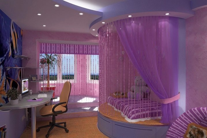 За да не е тежка атмосферата, по -добре е стените и таванът да бъдат бели, да поставите сив килим върху светлия ламинат, да поставите тъмносив бордюр до леглото и да поставите лампа с лилав декор върху него. Не забравяйте за възглавниците: за хармония трябва да повторите всички нюанси на интериора, като използвате подвижни капаци. За да стане по -интересно, можете да вземете корици с щампи в цвета на наличните тонове..