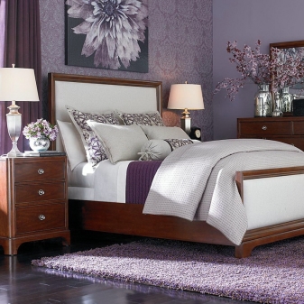 Лилавият цвят на спалнята е многостранен. Той включва много нюанси (лавандула, фуксия, патладжан, люляк, виолетово). Това определя стила и настроението на спалнята, създава определени впечатления..
