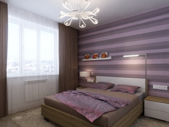 Люляковият цвят е любима тема за дизайна на спалнята. Той е много деликатен и ви позволява да създадете различен стил на интериора, като вземете предвид предпочитанията. За да направи цялостния облик на стаята пълен и хармоничен, люляковият нюанс се разрежда с богати акценти, в противен случай спалнята ще бъде избледняла и незабележима. Ако искате домашен уют и топла светлина от слънчевите лъчи, можете да залепите стените с тапети в широка лента с редуващи се люлякови и жълтеникави нюанси.