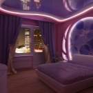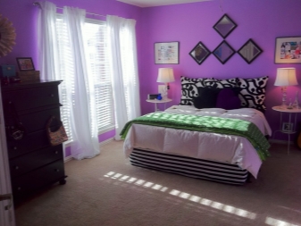 За да не е тежка атмосферата, по -добре е стените и таванът да бъдат бели, да поставите сив килим върху светлия ламинат, да поставите тъмносив бордюр до леглото и да поставите лампа с лилав декор върху него. Не забравяйте за възглавниците: за хармония трябва да повторите всички нюанси на интериора, като използвате подвижни капаци. За да стане по -интересно, можете да вземете корици с щампи в цвета на наличните тонове..