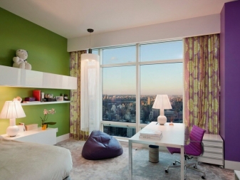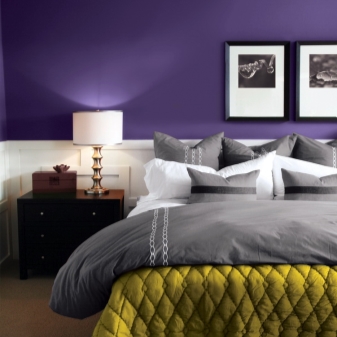 Понякога сред контрастите има зелен оттенък: спалнята в лилаво-зелени тонове е изпълнена със свежест, придава жажда за живот. Бяла и лилава спалня изпълнен със светъл, бял контраст добавя свобода в стаята и визуално прави стаята по -голяма. Жълто-лилава стая изпълнен със слънчева светлина, синият нюанс носи усещане за студ в спалнята, променяйки атмосферата, така че такъв акцент не трябва да се произнася.