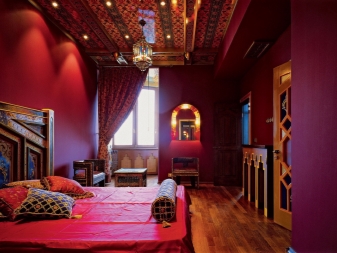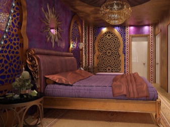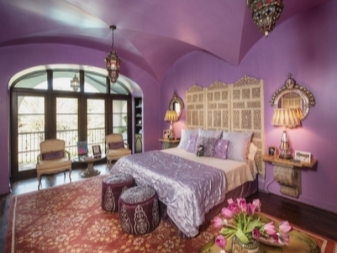 Феновете на арабския стил могат да залепят стените с лилави тапети с дантелена щампа, да изберат подобен цвят за опънатия таван и пода. За да предотвратите сливането на спалнята на едно място, струва си да добавите злато към лилавия цвят във формата первази, завеси, мебелни покрития и огледала. Два цвята обаче не са достатъчни за завършване на интериора. За да направите стила по -ярък, можете да използвате полилей и бяло пастелно бельо, както и тъмнокафяви кресла..