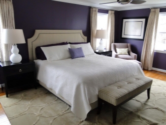 Прави впечатление, че изборът на акценти в този цвят е неограничен. Не може да бъде завеси, килим, пуфове, каре, ваза, картина в лилави цветове и дори художествена живопис с елементи на лилаво или неговите нюанси. Въпреки това, когато добавяте акцент, е важно да имате предвид: цветът е способен да създава различни визуални ефекти. В зависимост от избора на сянка и интериорни предмети, той може визуално да промени площта на спалнята, да я направи по -луксозна или по -опростена. Не трябва да е твърде много или твърде малко – необходим е баланс.