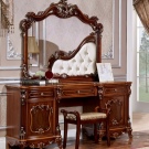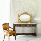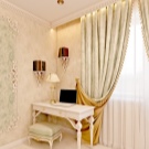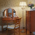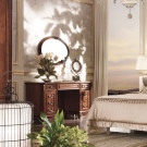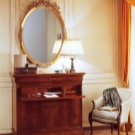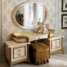 Стилна тоалетка може да се монтира и в спалнята. Изработен в класически стил, той идеално ще се впише в класическия интериор на стаята. Ако е допълнено с огледало, тогава ще ви бъде удобно да рисувате точно на място. Тоалетката трябва да бъде единствената масивна мебел освен гардероба и леглото. Не инсталирайте никакви бюра или други конструкции, които ще откраднат свободното пространство.